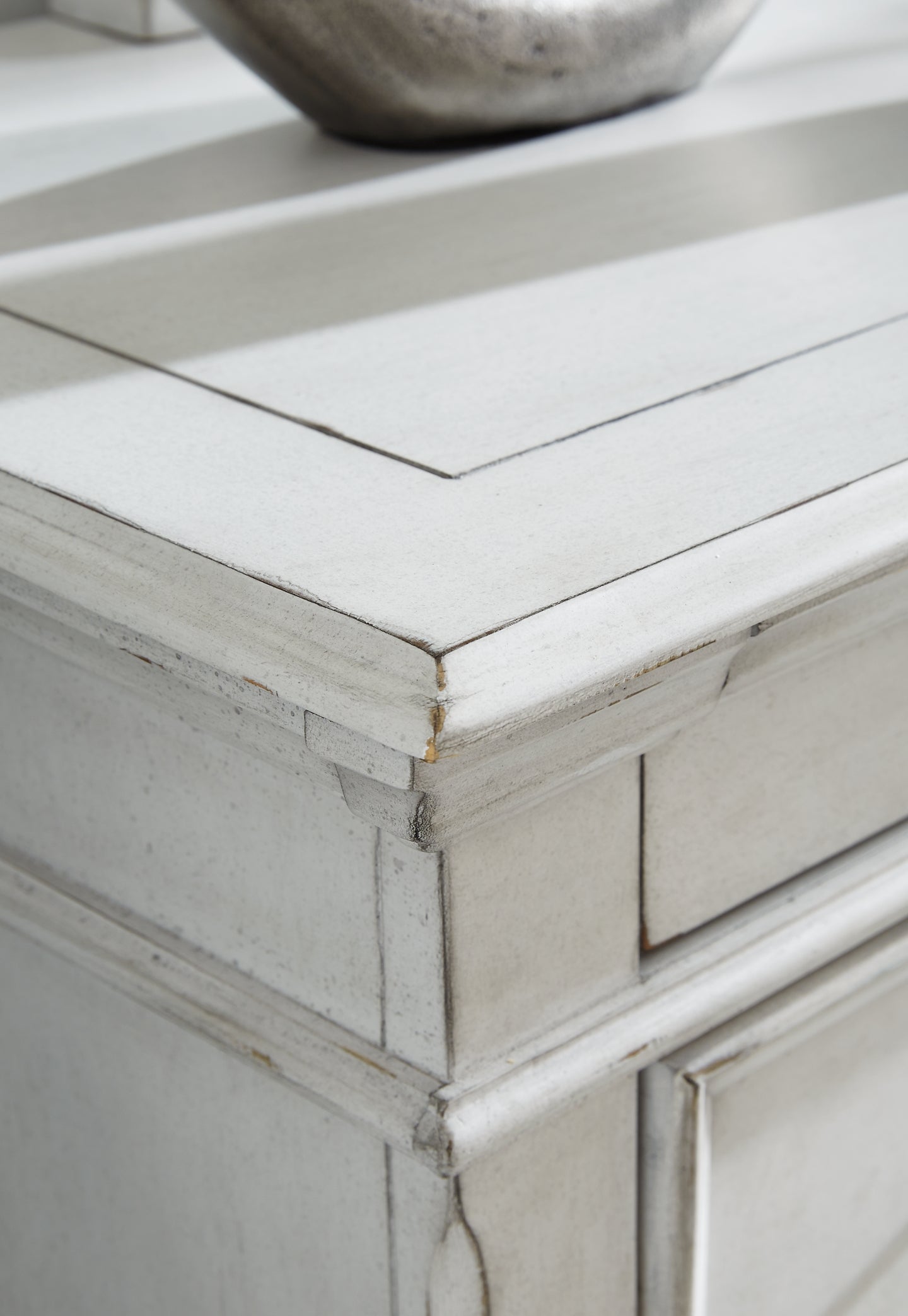 | Detalles | Incluye tocador y espejo, Fabricado con madera maciza, enchapados y madera de ingeniería, Acabado encalado envejecido, Herrajes de metal con acabado en tono peltre gris oscuro, 7 cajones de deslizamiento suave, más 2 cajones para accesorios de pequeña escala, El espejo se fija a la parte posterior del tocador, Requiere ensamblaje | |