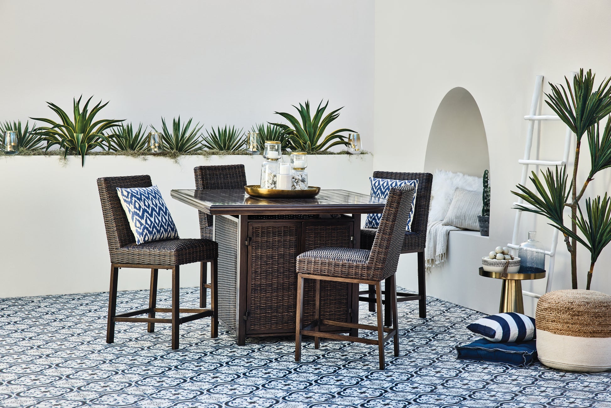 | Detalles | Incluye mesa para fogata y 4 taburetes de bar, Fabricada con mimbre de resina para todo clima tejido a mano sobre un marco de aluminio resistente a la oxidación, La mesa tiene una parte superior con apariencia de madera; paneles laterales acentuados con mimbre de resina tejido a mano para todo clima, El taburete de bar tiene patas de aluminio con acabado con apariencia de madera; reposapiés cómodo, Espuma de alta densidad en capas debajo del asiento, Herrajes de acero inoxidable, La mesa para fogata a gas cuenta con un quemador de acero inoxidable de 55,000 BTU aprobado por CSA, cuentas de vidrio, cubierta del quemador y cubierta protectora para todo clima, Sistema de encendido a batería con control de llama ajustable; batería incluida, La puerta oculta el tanque de gas propano (no incluido) y el área de almacenamiento con 2 estantes, El ensamblaje de la mesa para fogata se proporciona con la entrega a domicilio; no se proporciona la conexión al tanque de propano ni a la manguera del conector; convertible a gas natural, Tiene capacidad para 8 personas, Diseñado para soportar los duros elementos del exterior, Requiere ensamblaje | |