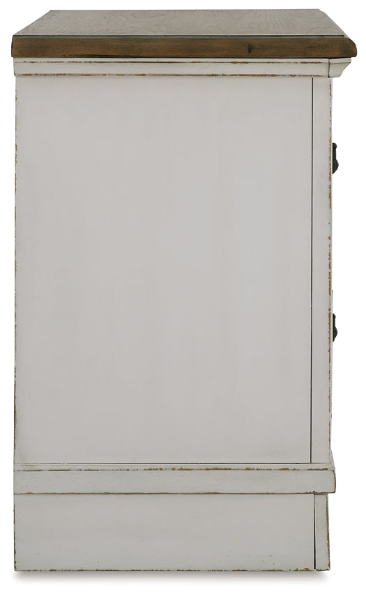 | Details | Made with hardwood solids, select wood veneer and MDF substrate, Two-tone finish (chipped white and brown wood-tone), Profiled drawer fronts and pilasters, Waist moulding, Metal hardware with dark bronze-tone finish, 2 smooth-gliding drawers with fully finished interiors, dovetail construction and metal ball-bearing side glides (top drawer felt lined), Assembly required | |