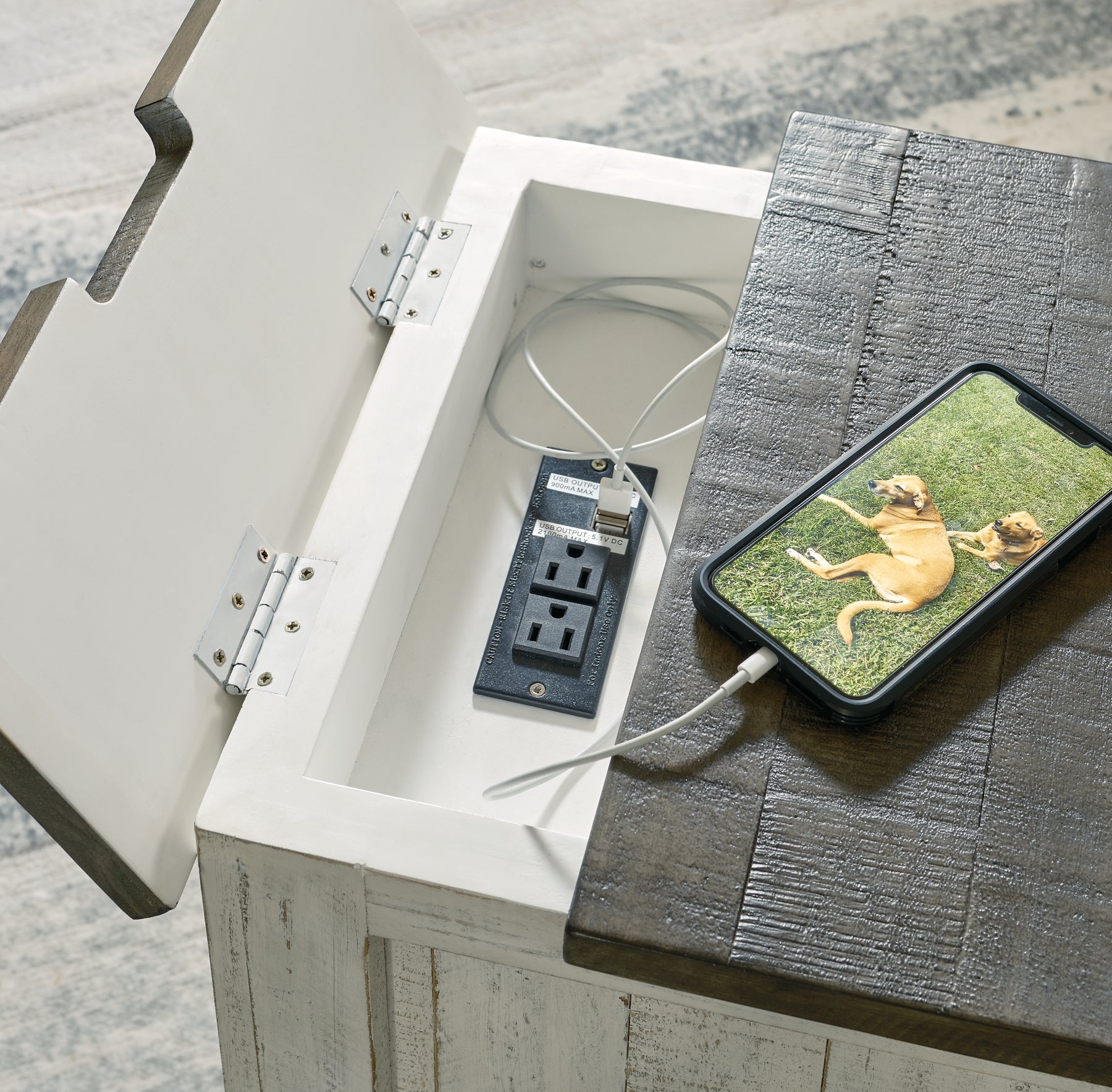 | Details | Made of pine wood, pine veneer and engineered wood, Two-tone finish; distressed weathered gray top with distressed vintage white base, Antiqued iron-tone hardware, Cabinet door reveals single fixed shelf, 110V power supply with dual USB charging port, Power cord included; UL Listed, Minor assembly required, simply lay flat and attach feet | |