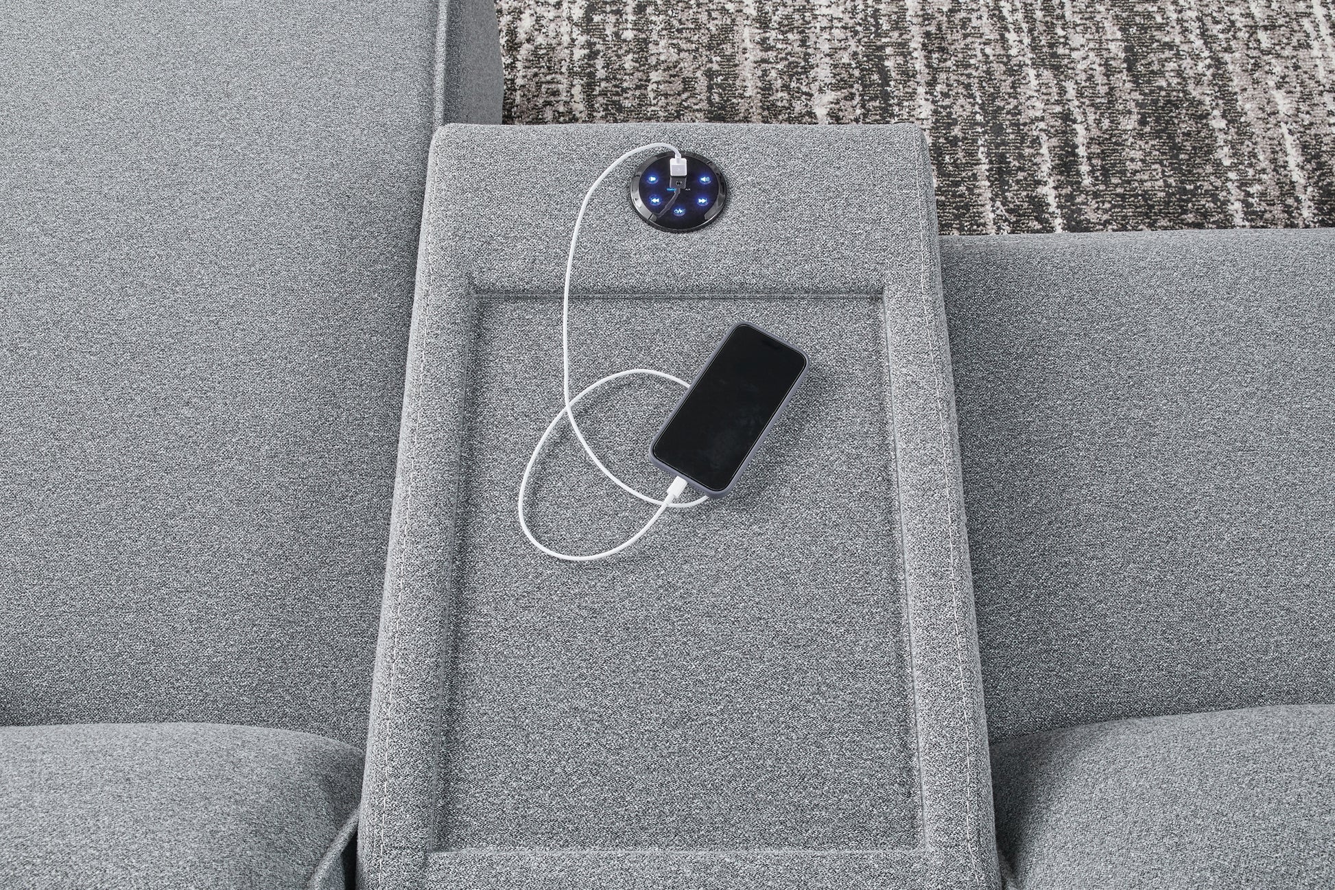 | Details | Includes 5 modular pieces: left-arm facing power recliner, armless chair, 2 consoles with audio systems and right-arm facing power recliner, "Left-arm" and "right-arm" describe the position of the arm when you face the piece, Versatile modular pieces fit together in a variety of configurations, One-touch power control with adjustable positions, Easy View™ adjustable headrest and zero-draw USB port, Zero-draw technology only consumes power when the USB receptacle is in use, Corner-blocked frame with metal reinforced seat, Attached back and seat cushions; high-quality foam cushions wrapped in poly fiber, Polyester upholstery; Next-Gen Nuvella™ is a performance fabric that is soft, easy to clean, stain-resistant and durable, Clean fabric with mild soap and water, let air dry; for stubborn stains, use a solution of 4 oz. bleach to 28 oz. water, Throw pillows with easy-to-remove zippered covers for machine washing; pillows with soft polyfill, Zero wall recliner design requires minimal space between wall and chair back, Console with plexiglass top; built-in audio sound system with wireless connectivity; audio controls located on console; USB charging, Power cord included; UL Listed | |